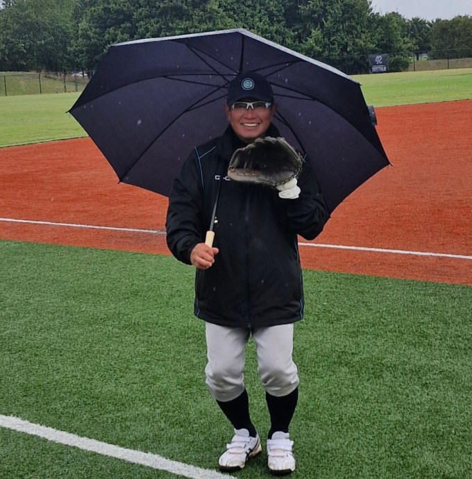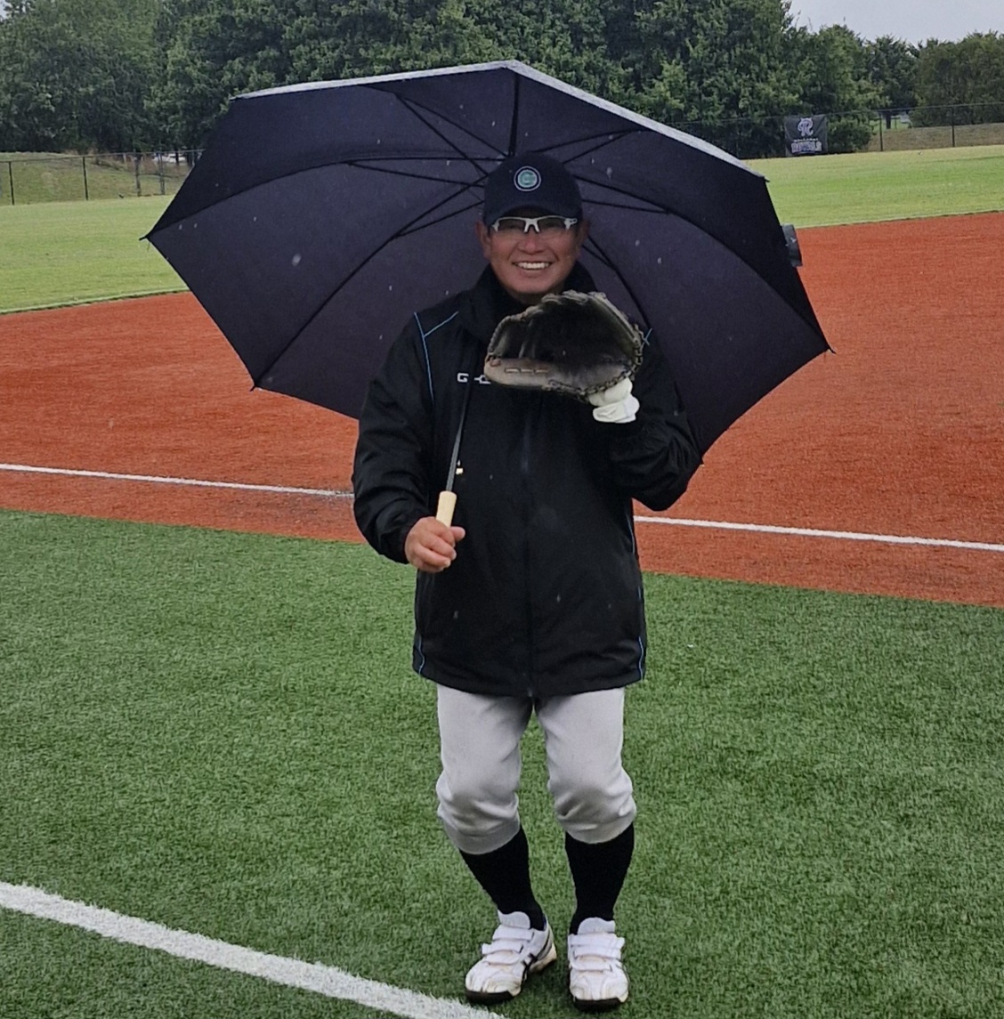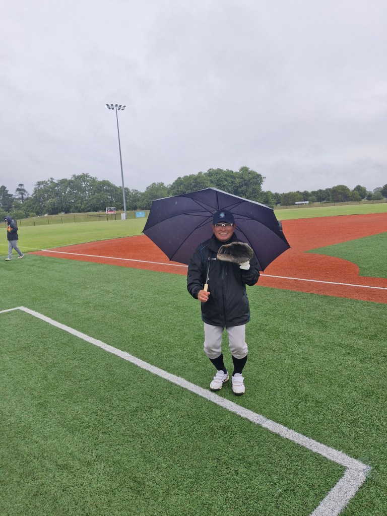 Many of you out there may be singing the next line to that song, but serial pest, Tetsu Kamiyama, took his umbrella onto the field to warm up on Thursday. In wet, cold, windy conditions, Tets kept dry by juggling the umbrella while having a warm up throw. Below is proof. However, now it’s raining more than ever………….. Tets can stand under his umbrella…….
