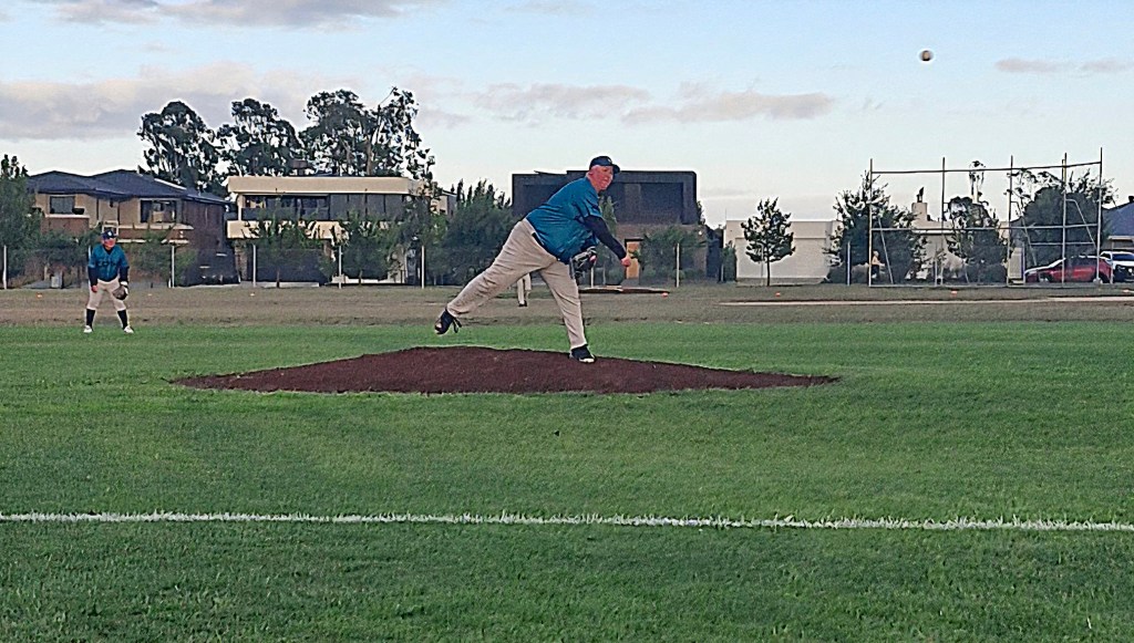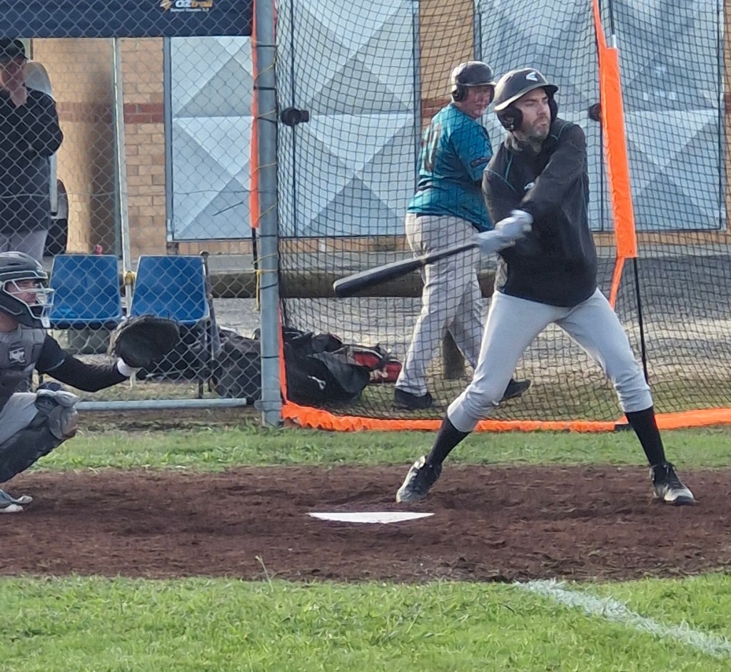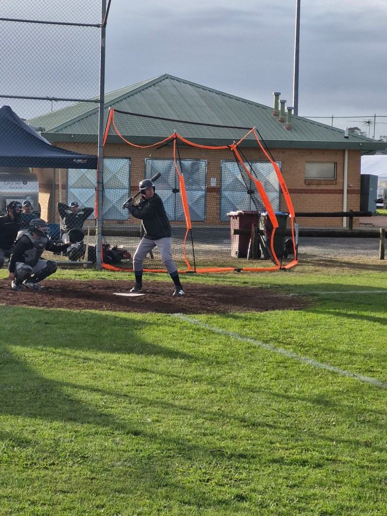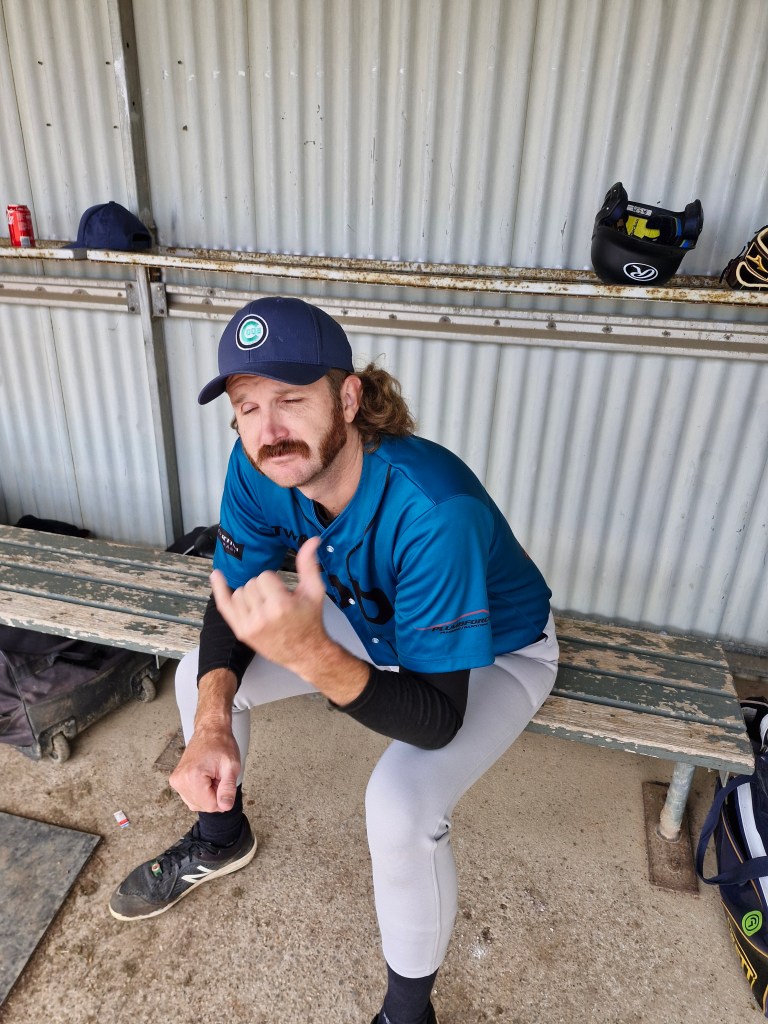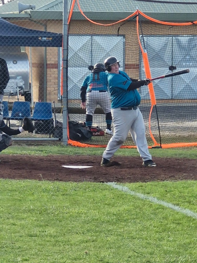 The Cods arrived in Ballarat with their usual expectations, and the Ballarat weather was  more fickle than in past Ballarat trips. However the doyen of Masters Baseball, Kingsley Collins, somehow managed to get a picture of a fingerling, Fraser Chadwick. It came to the attention of Line Drive while at a mandatory Cods meeting. This is a great achievement, as so far there has been no sighting of Frase wearing Cods gear. Thankyou Kingsley for making Line Drives job much easier, and as ever, you take very nice photos to use too.