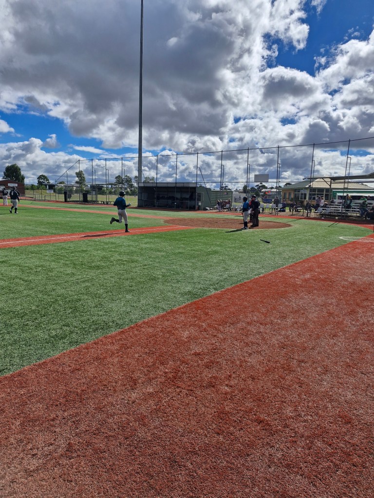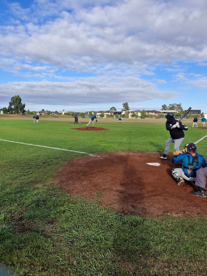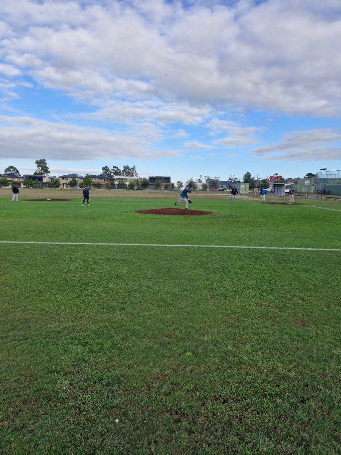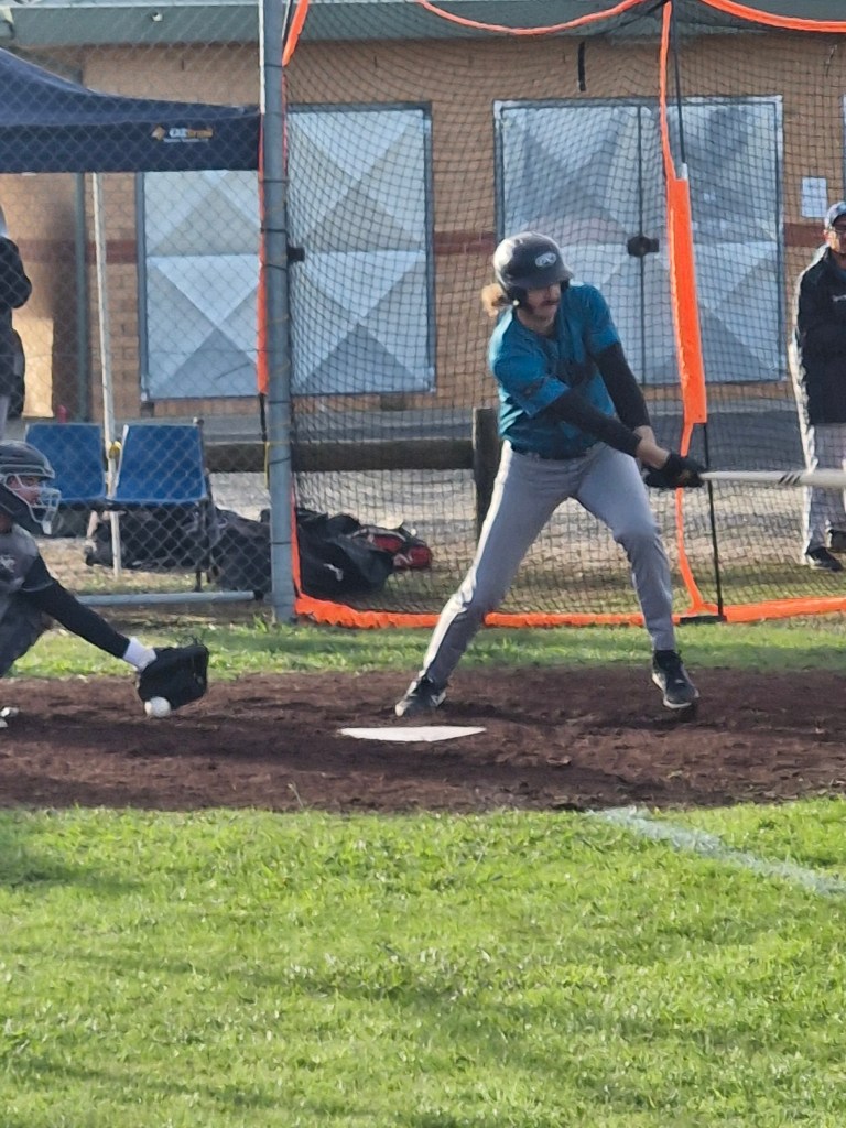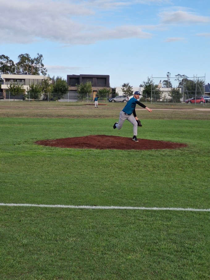 The Cods arrived in Ballarat with their usual expectations, and the Ballarat weather was  more fickle than in past Ballarat trips. However the doyen of Masters Baseball, Kingsley Collins, somehow managed to get a picture of a fingerling, Fraser Chadwick. It came to the attention of Line Drive while at a mandatory Cods meeting. This is a great achievement, as so far there has been no sighting of Frase wearing Cods gear. Thankyou Kingsley for making Line Drives job much easier, and as ever, you take very nice photos to use too.