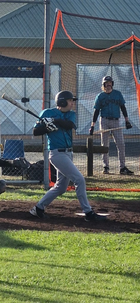 Kyle, “Thrillmore” Gilmore, returned to The Cods on Friday and his return was both refreshing and most welcome. He announced himself by almost tracking down a long foul ball early on in the game against the Vikings, and was razor sharp at the plate seeing six pitches with six very hard swings and misses. Then heading into the second game against the Bald Eagles, Gilly decided to do something else. He let the ball pass without swinging. Not once, not twice, but FOUR times to get a walk to first. Once he took occupation of first base, Gilly then let the first baseman know their pitcher was the only pitcher of the day that had not struck him out.  So the first baseman let the pitcher know.  Razor sharp as ever Gilly.
