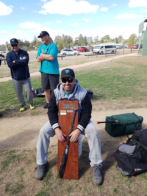 As mentioned before these carnivals are a great meeting point for catching up with former teammates. Sunday is always a fun day because it comes down to the question. Who has not yet got a hit for the weekend? In one teams case it was some one who you would not even think it could be possible. Sloths 35s Trevor Johansen. Let’s setup the last at bat. Bottom of innings Tassie up. Time finished. Umpire chief calling for game to be over. Sloths convince umps for one more at bat to see if Trev can get a hit. Sloths banter is top notch. Trev has three of the biggest cuts ( and one foul) you will ever see to strike out and end 0 fa for the weekend. Sloths started shopping Trev out for a trade to another team. But no takers. You certainly are a good sport Trev.